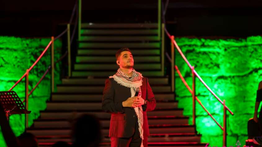 أحيا الفنان محمد عساف حفلا حمل عنوان “من أجل غزة” متزينا بالكوفية الفلسطينية بحضور وزيرة الشؤون الثقافية السيدة أمينة الصرارفي.