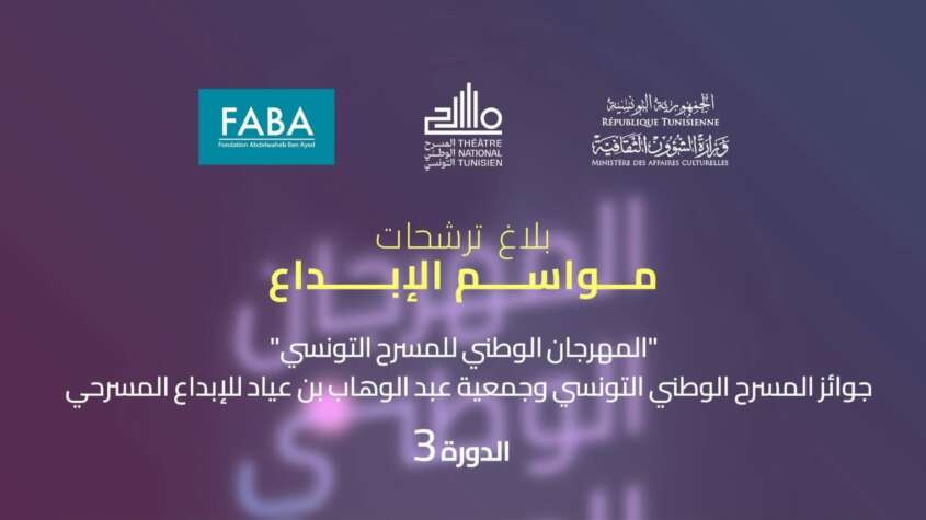 أعلنت الهيئة المديرة “للمهرجان الوطني للمسرح التونسي – مواسم الإبداع”، الذي ينظمه المسرح الوطني التونسي تحت إشراف وزارة الشؤون الثقافية وبالشراكة مع جمعية عبد الوهاب بن عياد، عن انعقاد الدورة الثالثة لجوائز المسرح الوطني التونسي وجمعية عبد الوهاب بن عياد للابداع المسرحي في الفترة الممتدة بين 01 و07 نوفمبر 2025، وفتح باب الترشح للمشاركة الى غاية تاريخ 10 أكتوبر 2025 بدخول الغاية حسب الشروط الآتي ذكرها: