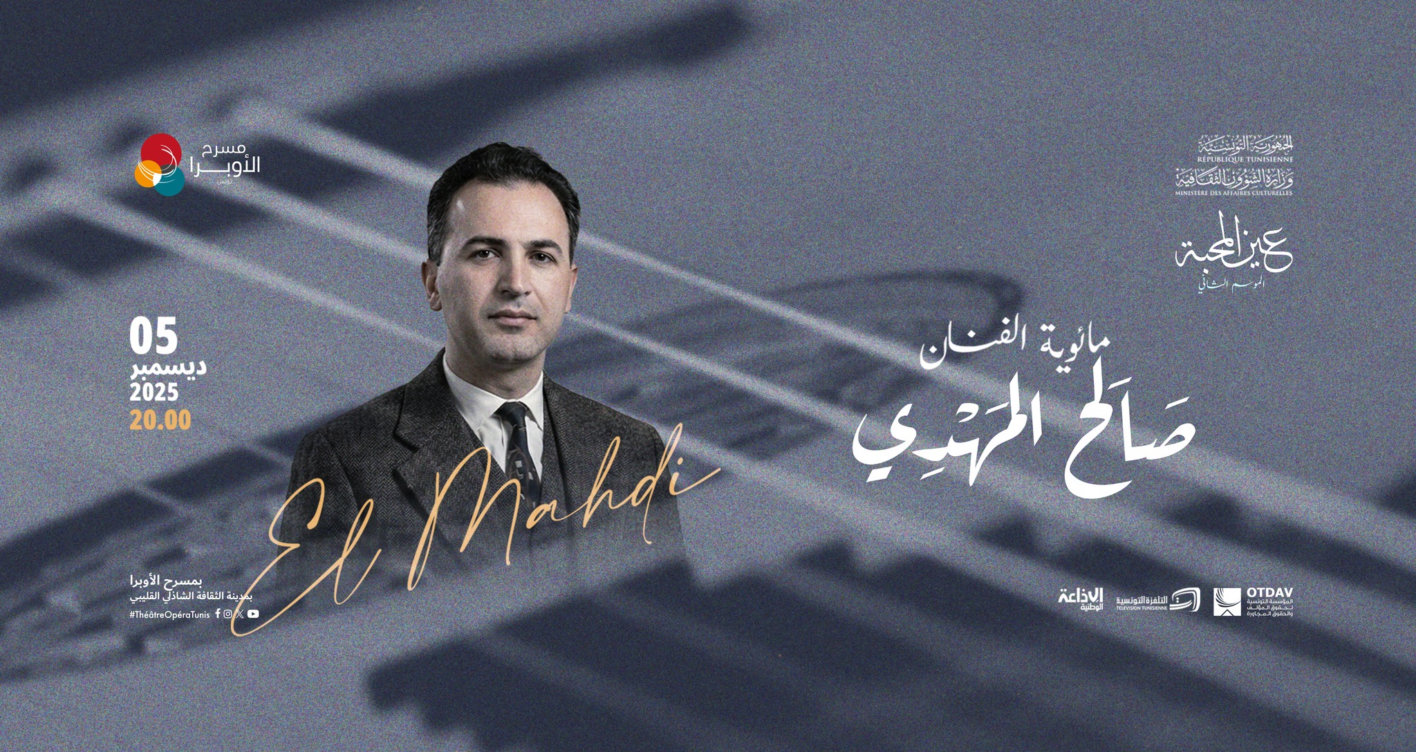 بمبادرة من وزارة الشؤون الثقافية، ينظّم مسرح أوبرا تونس بالتعاون مع المؤسسة التونسية لحقوق المؤلف والحقوق المجاورة مائوية الموسيقار الراحل صالح المهدي وذلك في اطار الموسم الثاني لعين المحبة بقيادة المايسترو شادي الڨرفي بمشاركة الأوركستر السمفوني التونسي و الفرقة الوطنية للموسيقى و أصوات أوبرا-تونس مساء الجمعة 5 ديسمبر 2025 بقاعة الأوبرا بمدينة الثقافة الشاذلي القليبي.