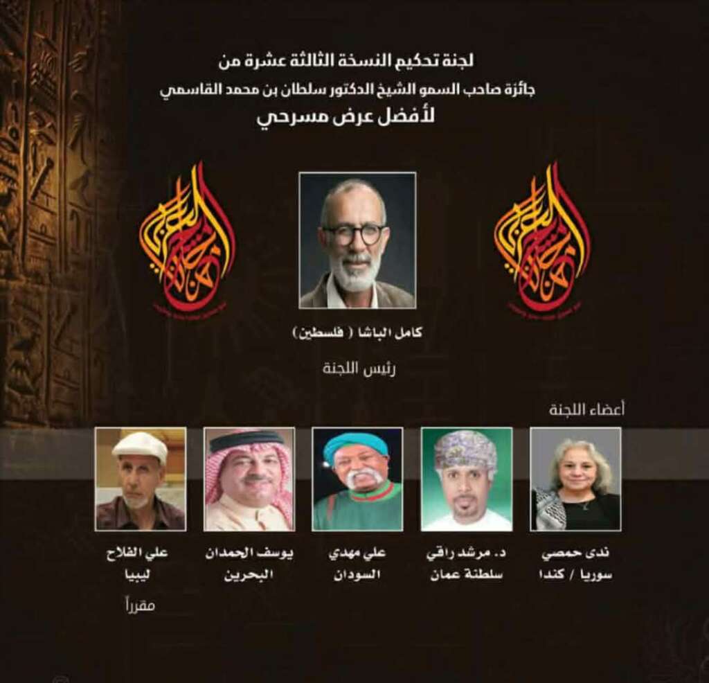 أعلن إسماعيل عبد الله، الأمين العام للهيئة العربية للمسرح، أسماء أعضاء لجنة تحكيم العروض المتنافسة على جائزة الشيخ سلطان القاسمي والتي يترأسها الفنان كامل الباشا من فلسطين والمتكونة من عضوية كل من الفنان علي مهدي من السودان، د. مرشد راقي من سلطنة عمان، الفنانة ندى حمصي من سوريا، يوسف الحمدان من البحرين، علي الفلاح من ليبيا، مقررا.